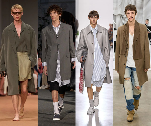 Para los cambios de temperatura, las nuevas colecciones proponen el uso de abrigos largos que eleven cualquier estilismo, combinándolos con prendas de entretiempo o incluso pantalón corto. Destacan los abrigos de Zegna y Ami Paris inspirados en el diseño clásico de las americanas, mientras que Bottega Veneta elige la piel para su propuesta y Maison Margiela lo hace con un abrigo de lana junto a unos vaqueros.