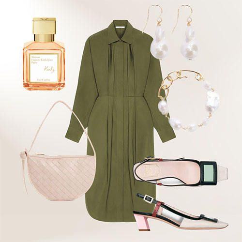 El color block se consolida como la gran tendencia de la temporada, permitiendo construir estilismos con diferentes combinaciones de colores complementarios, análogos o monocromáticos a partir del círculo cromático. En la imagen se combina un vestido verde oliva de Givenchy con accesorios en rosa – el color situado en el lado opuesto de la rueda – como unos zapatos de tacón de Roger Vivier, bolso de Bottega Veneta y joyas de Jil Sander. Para completar el estilismo, te proponemos la fragancia Kurky de Maison Francis Kurkdjian, con una familia olfativa fresca y suave para eventos de día.