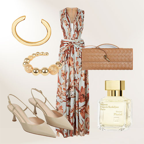 En esta vuelta del maximalismo, los estampados juegan un papel fundamental aportando un punto adicional de contraste y sofisticación. Este año dominarán los motivos florales repletos de color, que puedes combinar con accesorios que repliquen los tonos de la pieza central. Entre las diferentes propuestas, destaca un vestido con base azul cielo y tonos tierra de Costarellos combinado con un clutch de Bottega Veneta, slingbacks de Gianvito Rossi, brazaletes de Paola Sighinolfi y un toque de Féminin Pluriel de Maison Francis Kurkdjian, ideal tanto para eventos de día como de tarde.