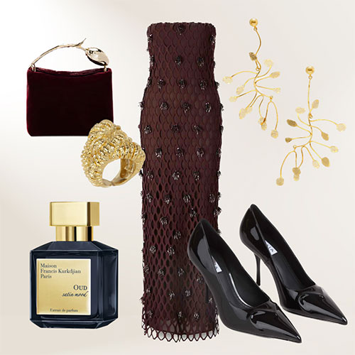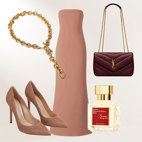 Siguiendo con las técnicas del color block, también existe la posibilidad de crear estilismos con un único color y diferentes intensidades. En este caso, el look se construye en base a un vestido palabra de honor de Safiyaa combinado con stilettos de Gianvito Rossi en la misma tonalidad. Como complementos, el bolso Loulou de Saint Laurent en color vino, un collar de Paola Sighinolfi y el clásico perfume Baccarat Rouge 540 con notas amaderadas y florales, perfecto para eventos de tarde y noche con clima templado o frío.