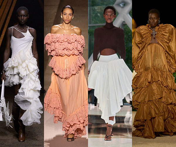 El estilo romántico seguirá dominando las tendencias, con los volantes como grandes protagonistas. A través de una imagen etérea y exagerada, veremos vestidos con tejidos fruncidos, asimetrías y motivos troquelados, como los que presentan McQueen y Chloé, junto a propuestas más opulentas. En este caso, destaca una falda estructurada de Alaïa y un vestido vaporoso que firma Saint Laurent.