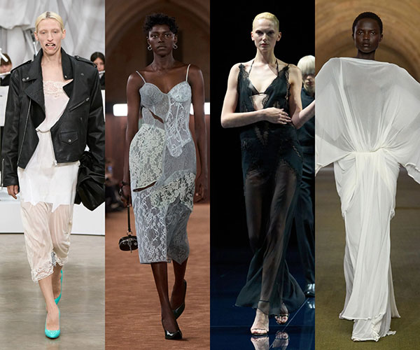 El cuerpo volverá a ocupar el centro del discurso como parte de esta búsqueda de libertad. En 2026, veremos transparencias mediante el uso de tejidos de tul, como el vestido fluido de Jacquemus, y del encaje como recurso para refinar las prendas. Destacan los vestidos lenceros de Maison Margiela y Acne Studios, que combinan tejido semitransparente con bordados, y una propuesta de noche de Tom Ford.
