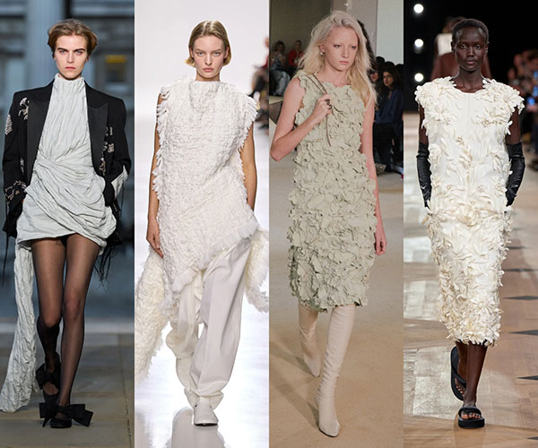 Siguiendo esta aproximación romántica y delicada al maximalismo, muchas firmas han apostado por un efecto recargado a través de la experimentación con materiales y sus texturas. En la pasarela se han presentado distintas versiones, desde un vestido drapeado en Erdem hasta un conjunto con nudos y flecos en Bottega Veneta, pasando por los vestidos midi de Altuzarra y Balenciaga confeccionados con tejidos tridimensionales creando un efecto floral.