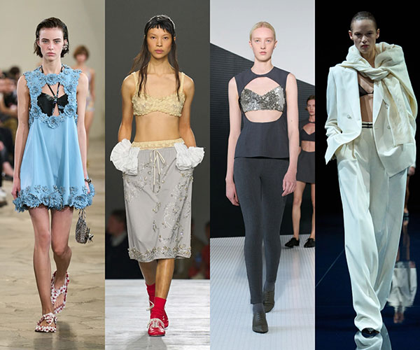 Parte de esta búsqueda de libertad se manifestará en el uso que se dará al sujetador y al bikini, pasando a formar parte del estilismo. En las colecciones de Rabanne y Jil Sander se han incluido diseños con aperturas que dejan el sujetador a la vista, mientras que Dries Van Noten lo transforma en la pieza principal a través de una propuesta bordada. Para los looks de noche, Tom Ford apuesta por combinar un traje de sastrería en blanco con un sujetador de encaje negro.