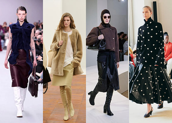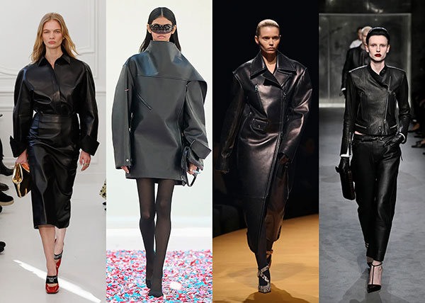 Terminamos hablando de la dualidad entre la fuerza y lo delicado que se materializa a través de los tejidos. Un año más volveremos a ver cómo los total looks de piel en todas sus formas ocuparán un primer plano. Por un lado, Givenchy y Courregès se decantan por estilos más sutiles con un conjunto de dos piezas y un vestido que juega con las proporciones. Por otro lado, Khaite y Tom Ford presentan una imagen más radical, con un abrigo largo inspirado en la clásica biker o una propuesta motera, todo combinado con accesorios de piel.