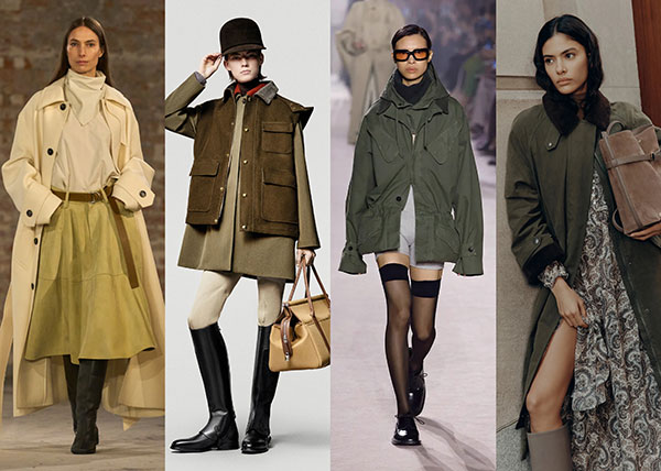 Junto a esta visión más cosmopolita aparece otra de inspiración campestre, con las parkas de color verde que encontramos en Victoria Beckham y Veronica Beard. Ami Paris se apodera de los tonos tierra y neutros para una propuesta más urbana, combinando un trench con blusa, falda de ante y un cinturón técnico. En el caso de Loro Piana, la casa italiana se inspira en el mundo ecuestre con un look protagonizado por un chaleco repleto de bolsillos, pantalones ajustados y botas de montar a caballo.