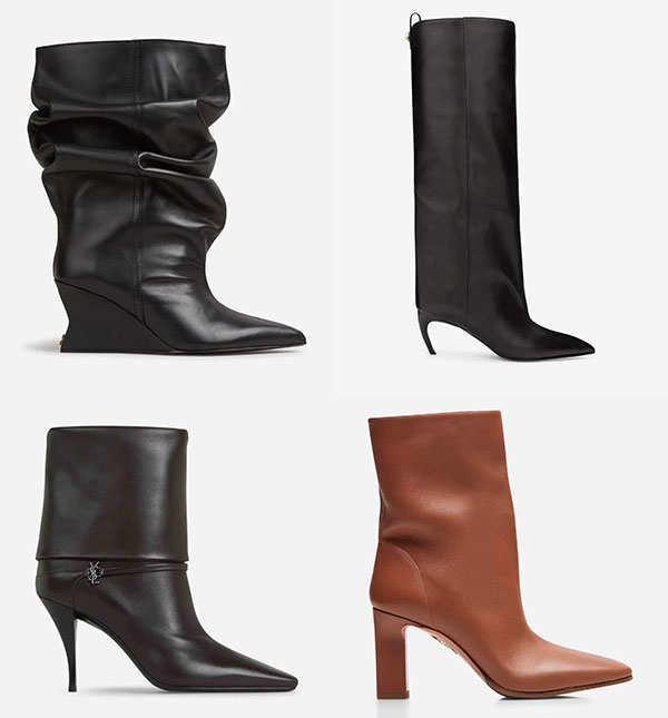 Siguiendo con las botas para mujer, este viaje al pasado también ha permitido recuperar una estética boho chic centrada en las piezas holgadas y con movimiento. En el caso del calzado, se traduce en botas con la caña ancha, como presentan The Attico y Aquazzura, junto a las propuestas de Balmain y Saint Laurent, cuya caña queda fruncida o con media vuelta para un resultado más sofisticado.