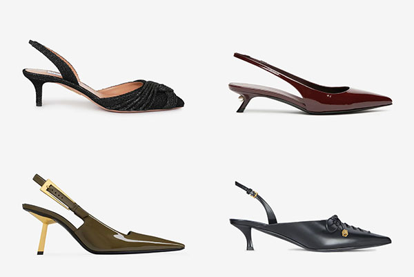 El gran sinónimo de la moda más sofisticada de la próxima temporada son los slingbacks, las populares sandalias destalonadas perfectas para conseguir un punto elegante. Aunque estén asociadas a los looks más formales y de noche, se trata de un tipo de zapato que se puede combinar con faldas midi, trajes de sastrería o incluso vaqueros. Entre las múltiples propuestas, Aquazzura y Givenchy presentan dos modelos en negro y Aleví Milano y Saint Laurent se decantan por los diseños con piel de charol, todos ellos con un sutil tacón bajo.